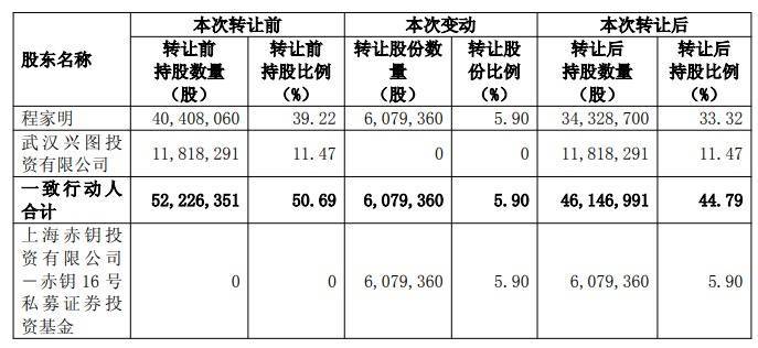 本次权柄变动前,公司控股鼓吹、实质限制东说念主程家明平直执有公司股份40,408,060股,占公司总股本的39.22%,其一致行径东说念主武汉兴图投资有限公司(以下简称“兴图投资”)执有公司股份11,818,291股,占公司总股本的11.47%,共计执有公司股份52,226,351股,占公司总股本的50.69%。