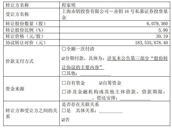 中国经济网北京4月1日讯 兴图新科(688081.SH)昨日发布对于控股鼓吹、实质限制东说念主公约转让部分公司股份暨权柄变动的教导性公告。兴图新科控股鼓吹、实质限制东说念主程家明(以下简称“转让方”)与上海赤钥投资有限公司(代表“赤钥16号私募证券投资基金”,以下简称“赤钥基金”或“受让方”)于2026年3月28日共同签署了《股份转让公约》。转让方拟通过公约转让口头向受让方转让其执有的兴图新科6,079,360股股份(占公司总股本的5.90%)(以下简称“主见股份”),转让价钱为30.19元/股,股份转让总价款为183,535,878.40元。